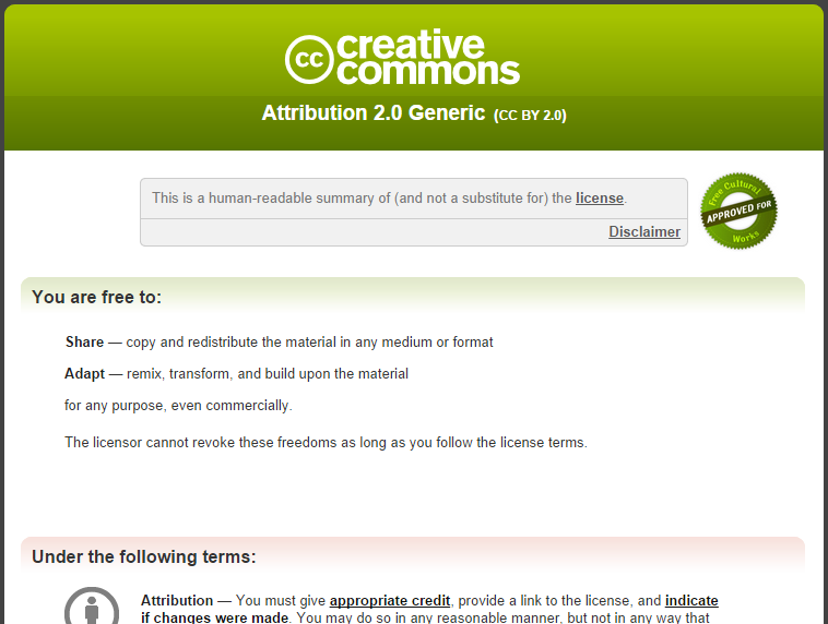 Alternately, you can simply put the type of the license rather than linking, but this is far short of ideal. Attribution, according to the licenses, must be done in a “reasonable” way. That means, for example, you don’t have to ruin whatever you’re working on by stuffing it with extra-long attributions. A link to the photo’s page on websites like Flickr along with the creator’s name is usually enough, since the pertinent licensing information can be found there.