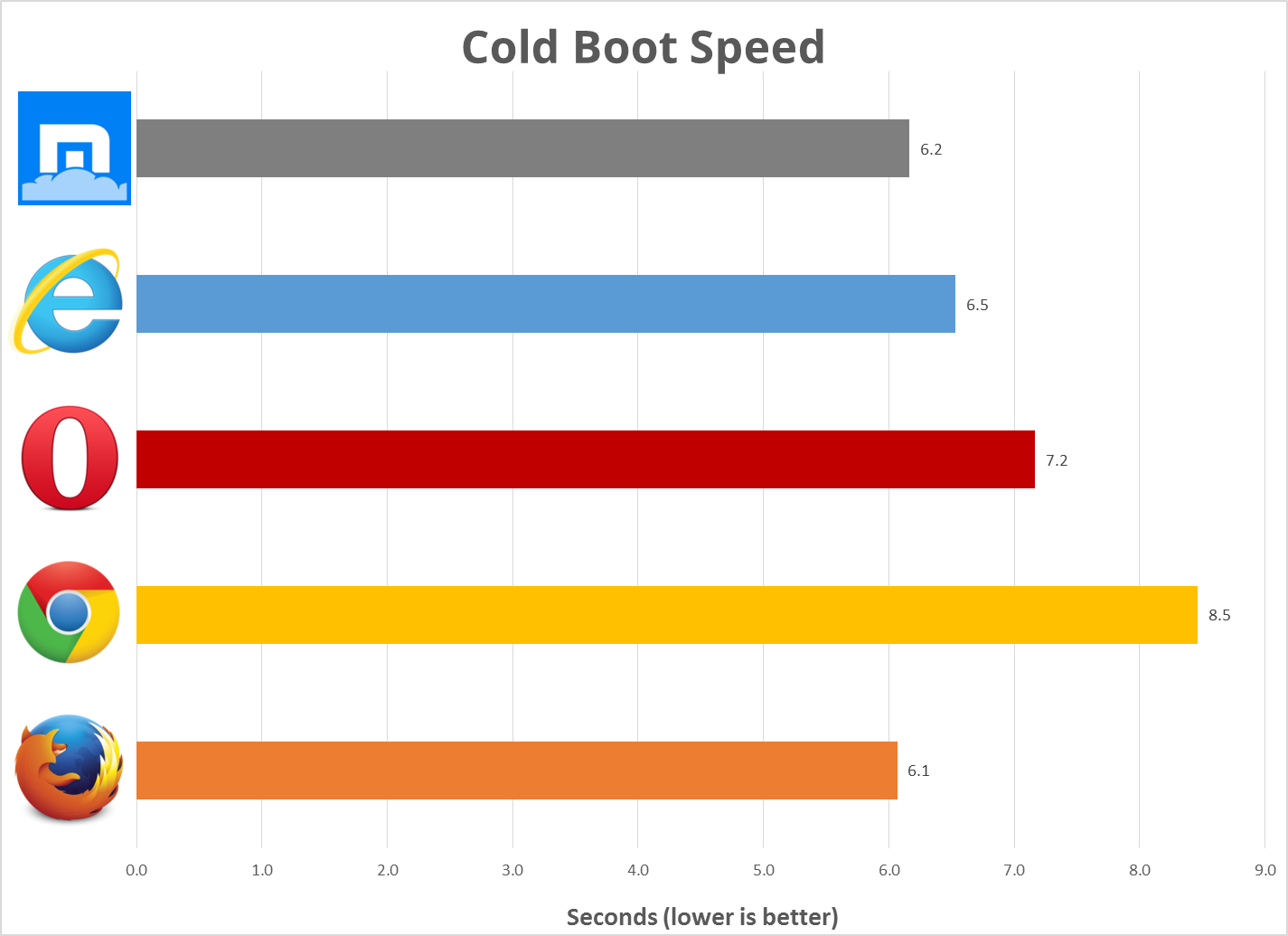 First, we ran a test of how long it takes each browser to start up without having been run previously. We call this a “cold boot” to distinguish from starting them up when they have already been started since the last time you restarted the computer. We performed this test four times on each browser, alternating the order in which we started up each browser. These were hand-timed. To help account for this, we threw out the worst score for each browser before averaging the results. This is the time from click until the browser and its opening page is completely loaded and ready for use.