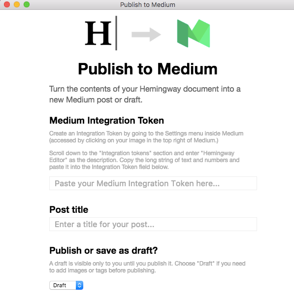Publishing to Medium is very similar, but you do need to get an “integration token” first rather than entering login information. Medium posts probably lend themselves to easier publishing straight from Hemingway since multimedia is less common and users tend not to use tagging and the like as much as self-hosted WordPress sites.