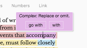 In the above example, Hemingway is complaining that “accompany” is a needlessly complex word. It suggests using “with” or “go with” and it will replace the word “accompany” with one of those if you click one of the buttons presented. Note that you’ll have to use your brain a bit with these suggestions, since “with” would not make sense in the sentence, though “go with” would work well.