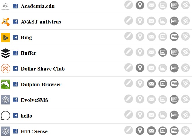 Here’s a selection of my Facebook connected apps as seen through MyPermissions. The circle that is highlighted for each app is that basic permission level that allows the app to see your name, email address, contacts, and possibly some other basic info. The bubble with a picture in it denotes access to photos and other media files. The envelope means the app has access to my messages. The pin icon signals that the app can know my location (at least, whenever Facebook knows my location). The pencil would mean that the app can act on my behalf (make posts, etc.).