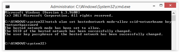 netsh wlan set hostednetwork mode=allow ssid=networkname key=networkpassword