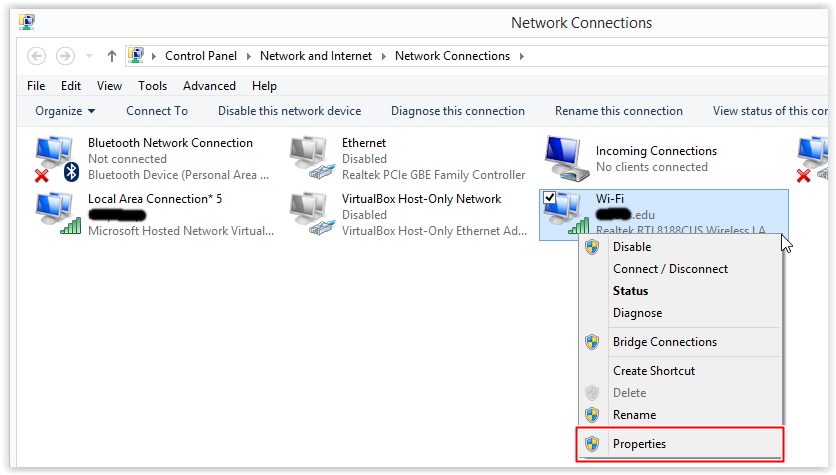 It will probably say that it isn’t connected to the internet at this point, though, so do not worry. To fix this, right-click on your current Wi-Fi connection and then click on properties (you will need administrator privileges for this, too).