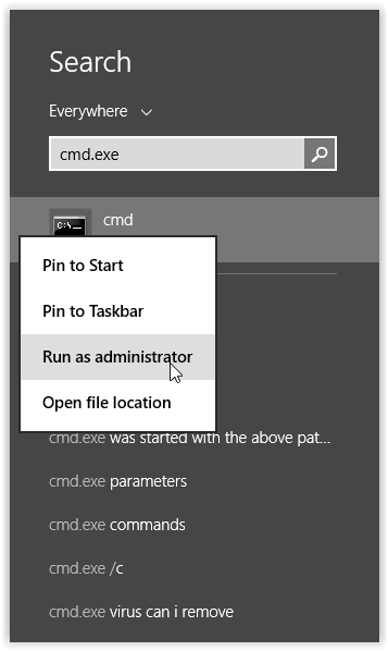 To proceed in checking your computer’s capability, you need to open up a command prompt. This is a way of manually entering commands that is pretty much only done by us nerds nowadays, but was once the main way we interacted with our computers. The simplest way to open up a command prompt is by searching in your start menu, something I’ve demonstrated with Windows 7 and 8 set-ups. Once you see the “cmd.exe” you’re looking for, right-click and click on “run as administrator.” If you don’t have administrator access, you’re going to need it.