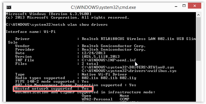 The information we are looking for is “hosted network supported” and we want the answer to be yes. If it is no, you can try to update the driver through the manufacturer – the name of the wireless card is the first line you see. In this example, it is “Realtek RTL8188CUS . . .” so you could probably google that term plus “driver” and there might be something for you. If not, you may not have a new enough card for that.