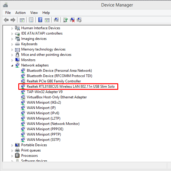 - Open _Device Manager _either through your control panel or by searching from the start/search menu. Scroll to the section labeled Network adapters and find your wireless card. It should go by the same name as its model number, so in this example it will be RTL8188CUS.