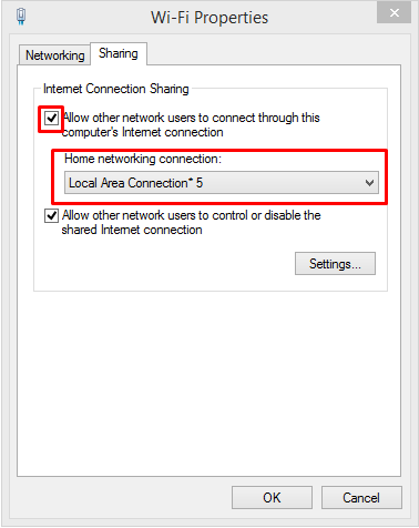 Once there, you want to check the box that says “allow other network users to connect through this computer’s internet connection.” Then, go to the dropdown menu and select the hot-spot you created, which will be labeled “Local Area Connection* 5.”