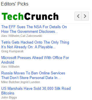 **Editor’s Picks: **This doesn’t require such a stringent editorial eye. Chances are, your fledgling site’s Editor’s Picks won’t be seen. What this does is create a feed where, if Google chooses, the 5 most recent Editor’s Picks will be displayed alongside Google News search results. Here’s what that looks like:
