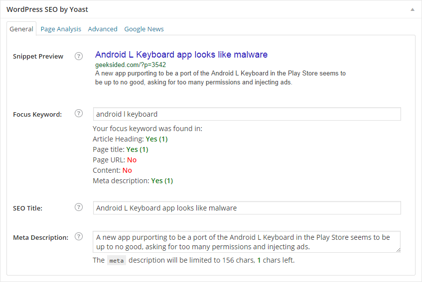 WordPress SEO by Yoast should serve as a quick check on SEO basic best practices. There might be a few circumstances in which your article will have “good” SEO despite the free Yoast plugin saying it does not, but chances are you are the one in the wrong if you are consistently at odds with it.