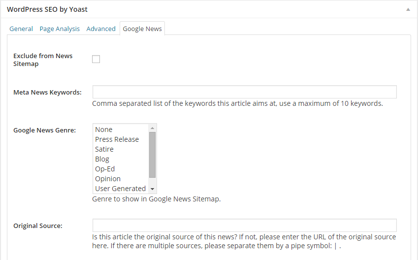 Now to the meat and potatoes. This tab is the part that appears once you buy the Google News SEO by Yoast plugin. Otherwise, you won’t see it at all. Neglecting this will almost certainly doom your site’s chances at good ranking in Google News!