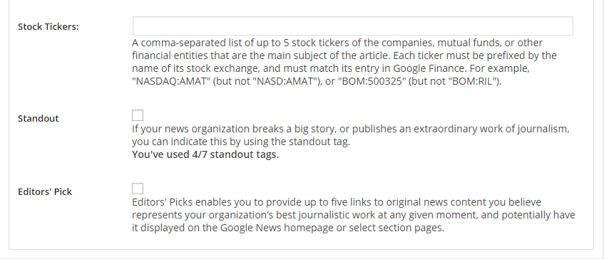 Standout**: **You can check this box to signal that this particular piece is _really _good. While Google is somewhat vague about what would qualify and probably overstates the requirements, use this for your very best work. Save it for original reports or your best, most in-depth opinion pieces.