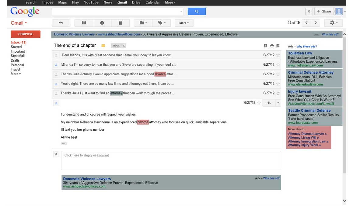 Indeed, Yahoo, Google, and Apple are also among the providers who make you click “agree” to terms that include handing over the right to your emails’ privacy. While Microsoft’s latest intrusion seems to contradict the crux of their “Scroogled” campaign, there is a key difference to bear in mind. Google reads your email rather shamelessly in order to target advertisements to you. Microsoft provides an apt example of how creepy this can be: