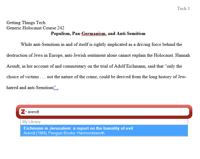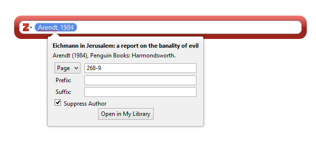 You search for your source, click on it, and then decide whether you are going to add more in this spot. You can then add page numbers to each citation and decide whether or not you want to hide the author’s name. Voila! In-text citation.